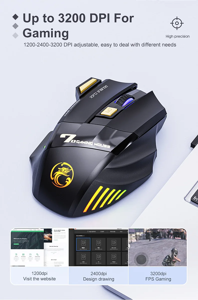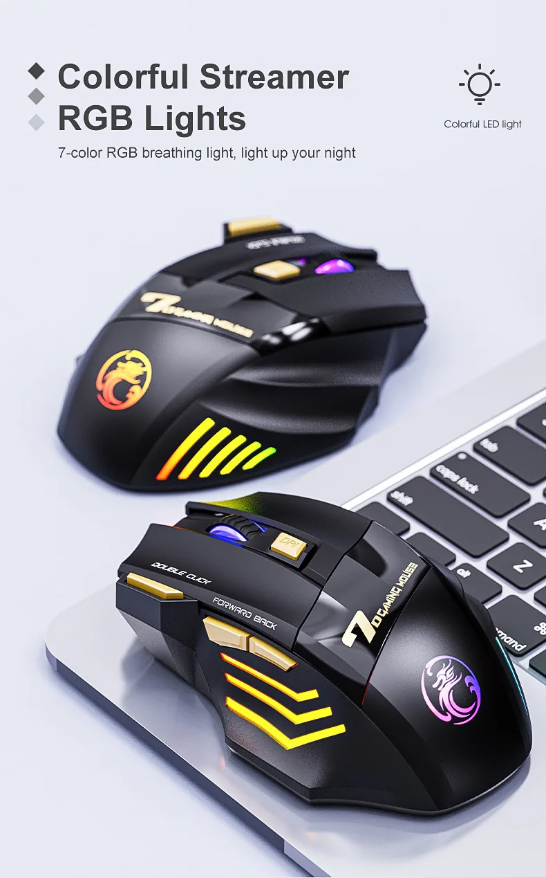 Wireless Gaming Mouse 2.4G Bluetooth Dual Mode 7 Keys 3200 DPI Regulation Mice with Muted Click RGB Lighting Recharge USB GWX7